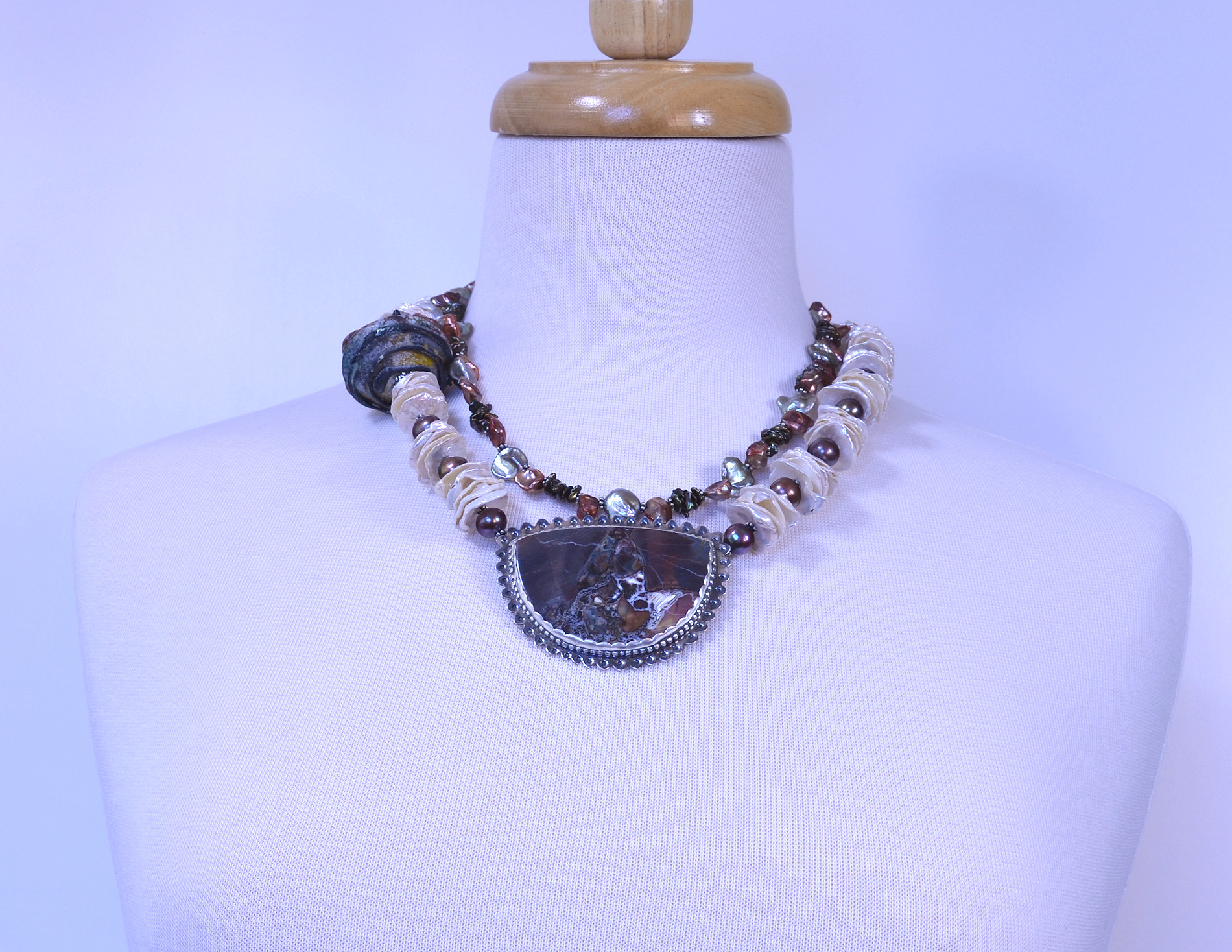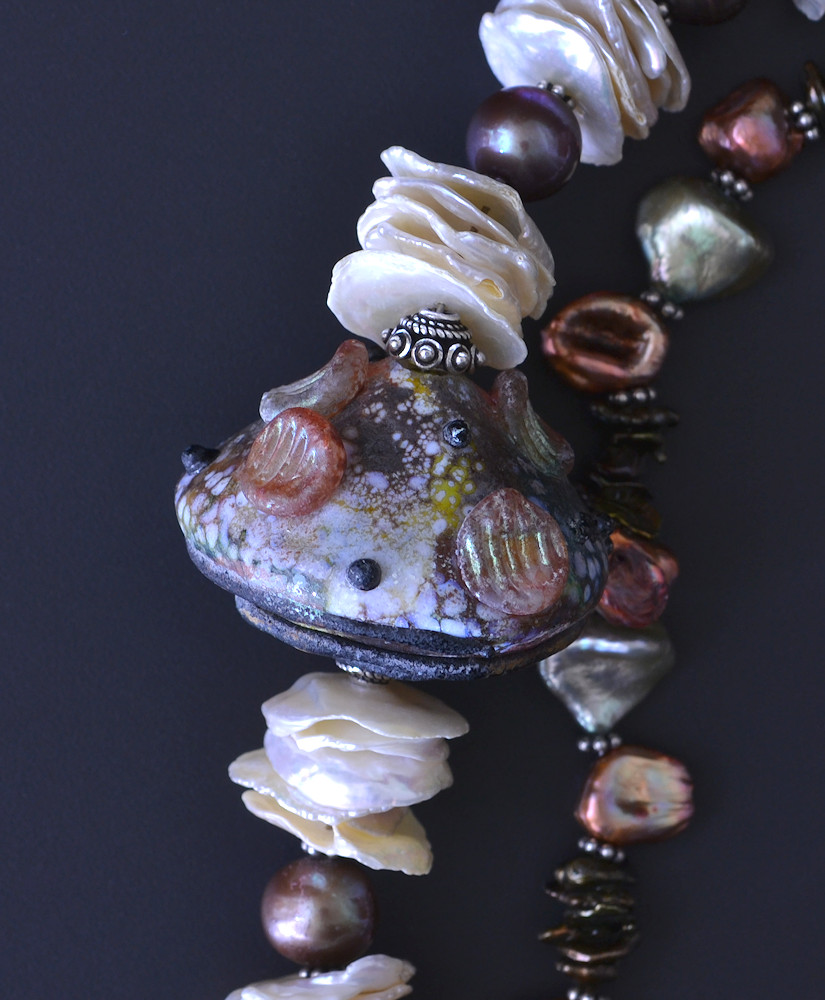 Karen's beautiful glass bead adds a bit of a surprise to the white pearl strand.