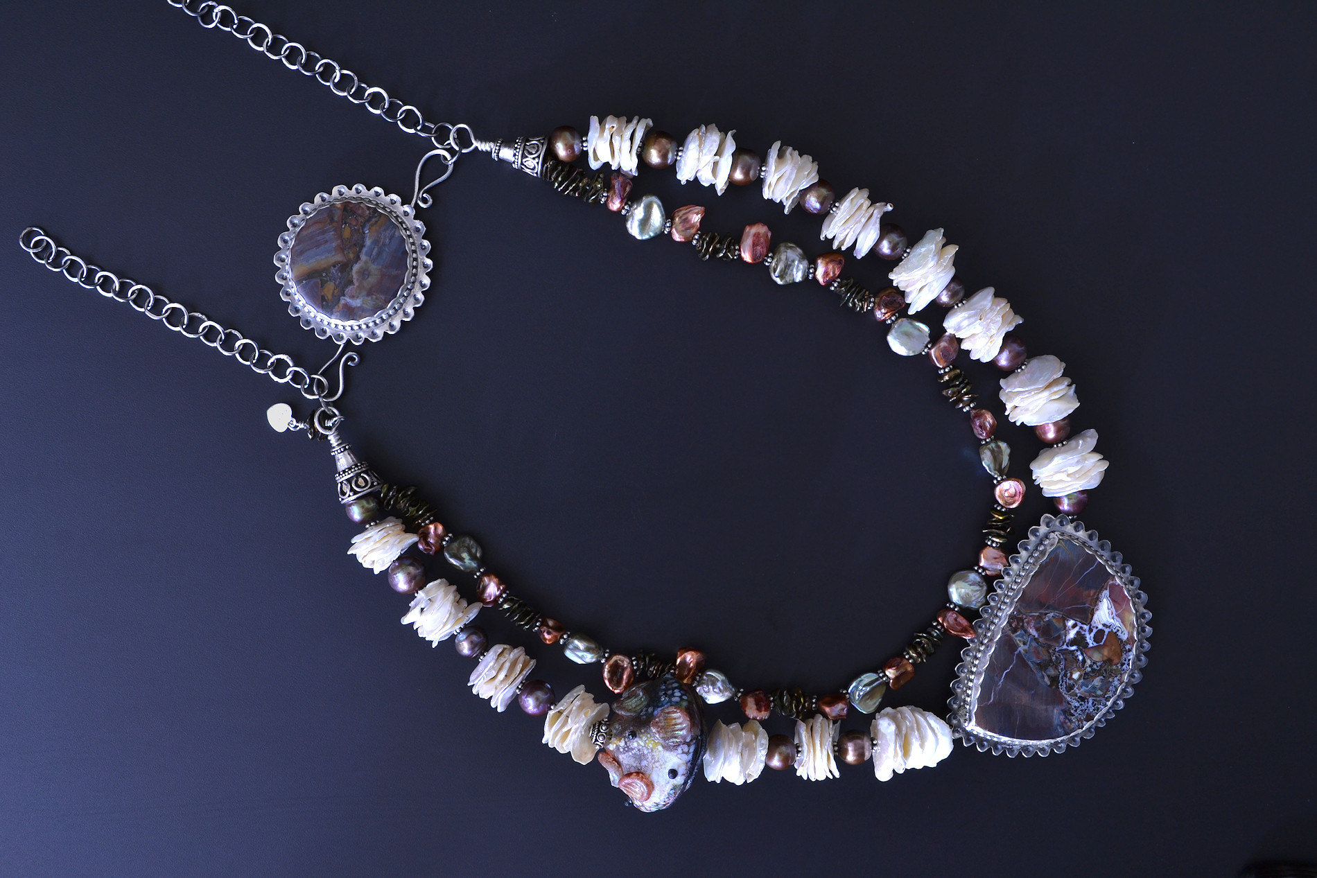 The reason the extension on the back of this piece consists of two hand-made chains instead of my usual single chain is that by adjusting the length from both sides, the large cabochon will remain at the center of the back of the neck.