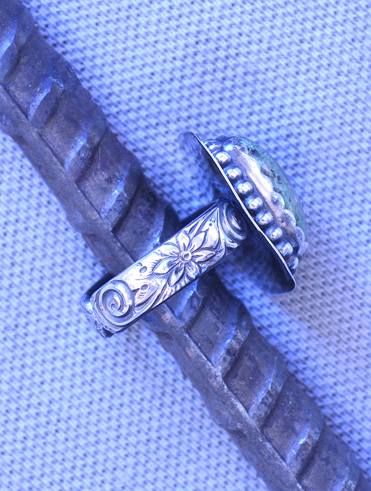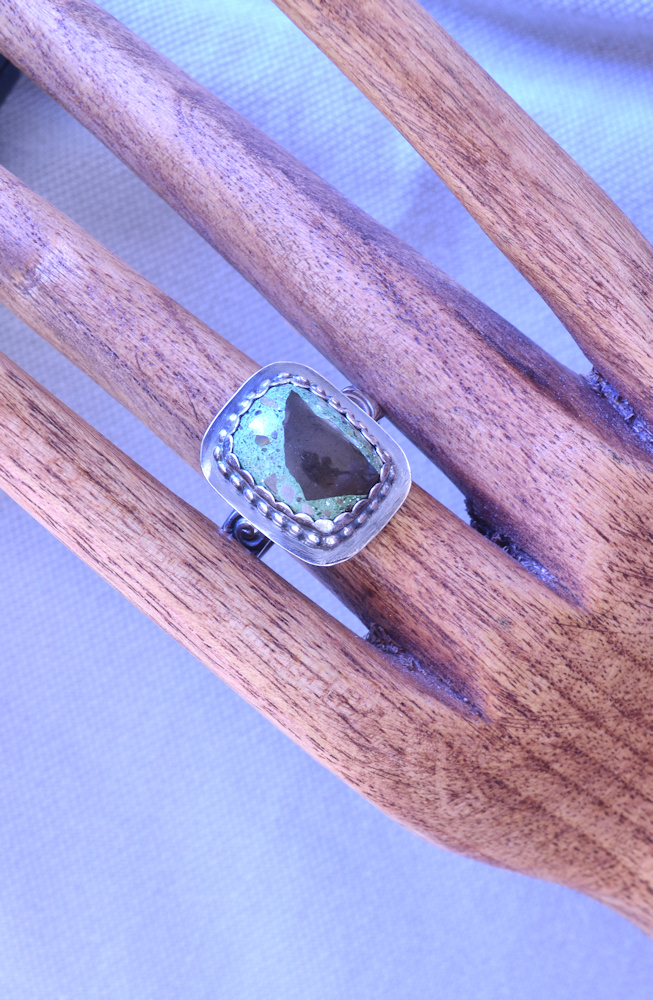 Sorry, I digress. We were talking about this strange and often beautiful by-product that washes up on the beaches of Lake Superior where it is avidly collected for use in jewelry. Our little green stone with its brown inclusions is a very unusual example of Leland Slag and has a fascinating history as well. Won't you order it today? The ring is adjustable, please give me your ring size when you order.