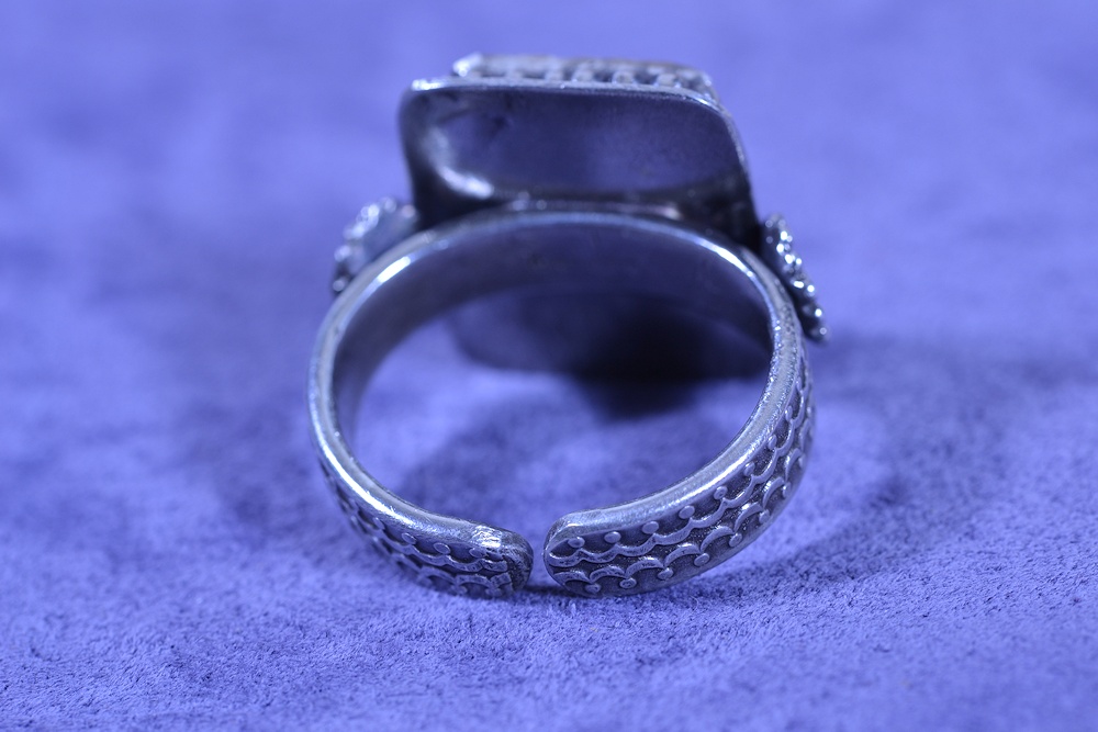 Here's a pretty little stone with lovely layers of color to brighten your day! The band has a squiggly pattern to reflect the pattern in the stone.