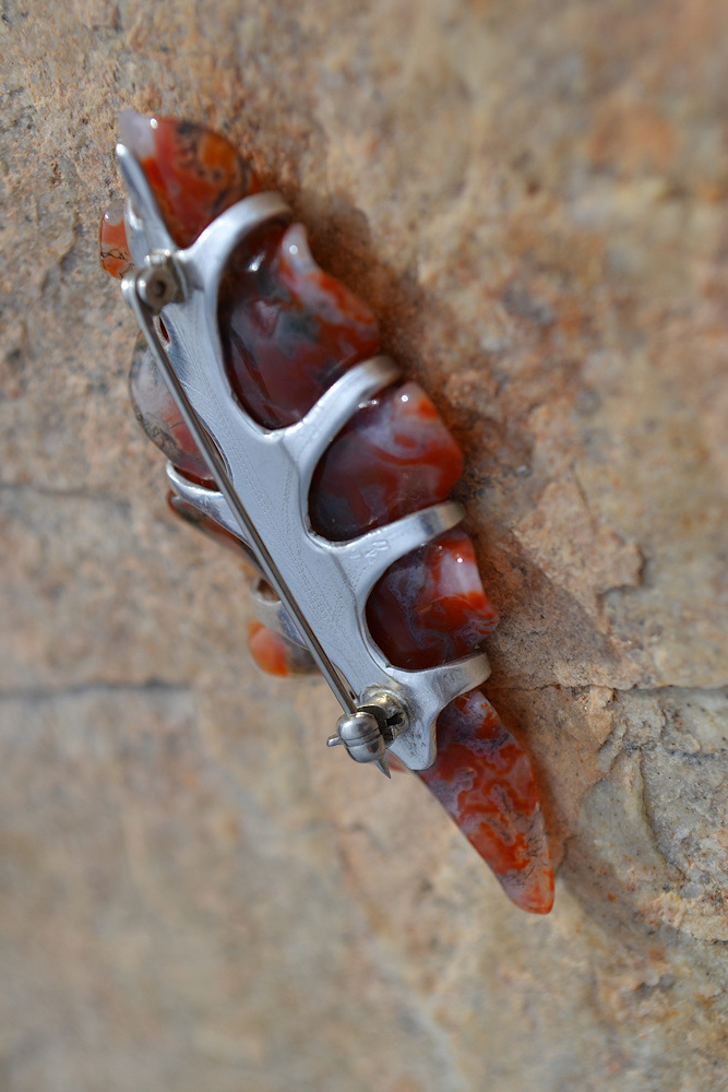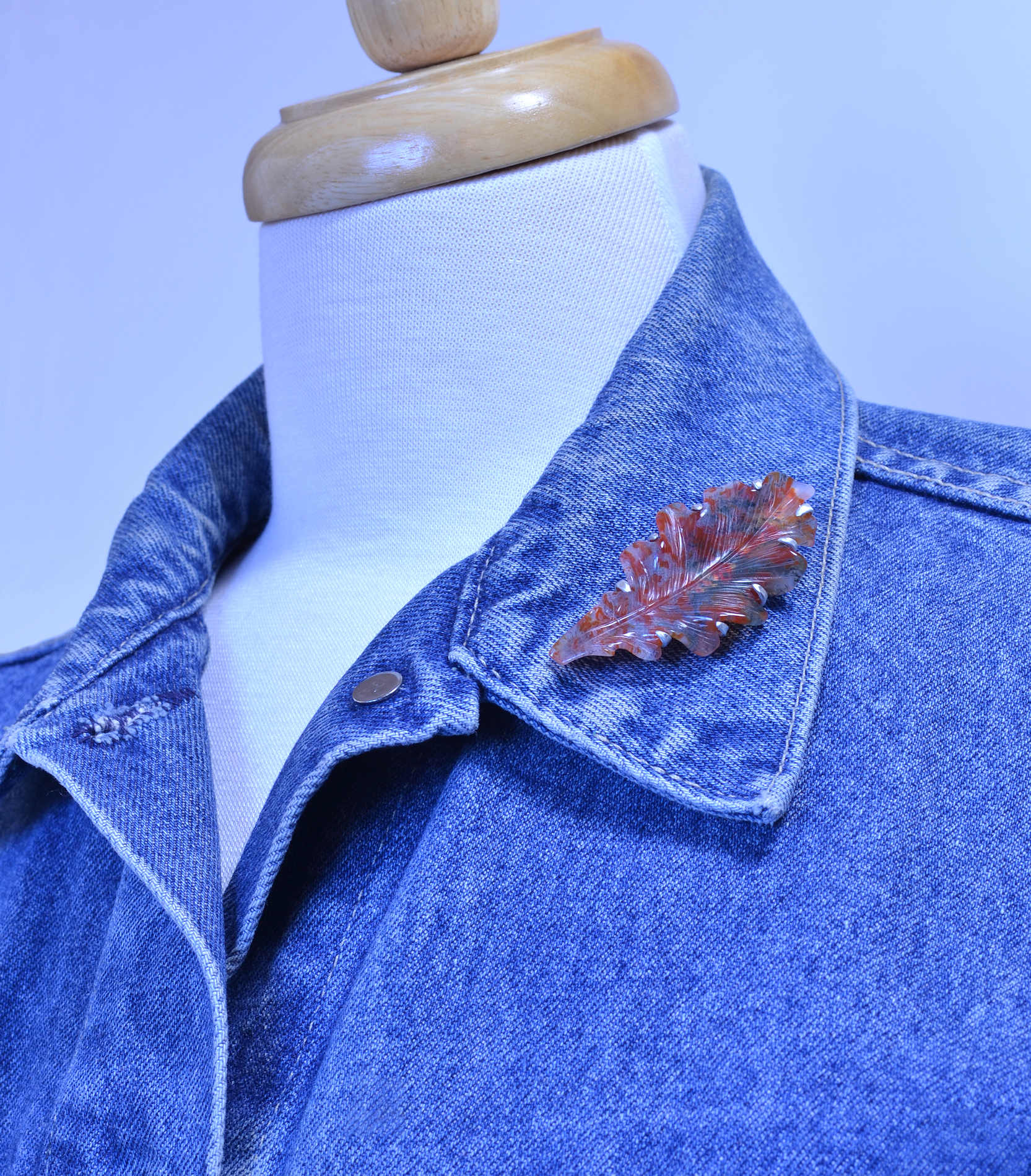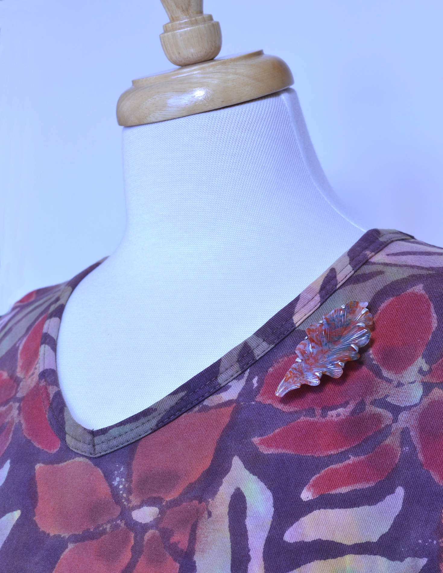 The colors are those of a fall leaf just turning from green to red. I captured it in a simple, unobtrusive setting so it would look like you picked up a natural leaf to wear as jewelry. You can wear it as shown, or stem up so the leaf is falling. Either way, its subtle curvature complements the curve of the neck.