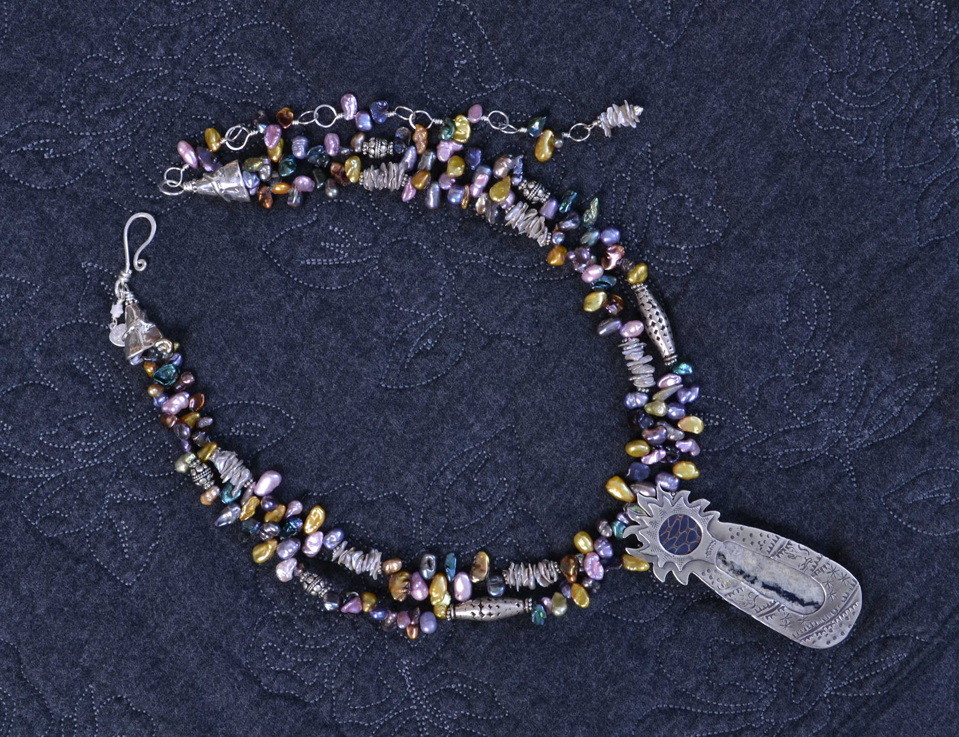 By this time, my original design for the piece looked dorky, so I changed it to look like a shaman with his flying hair, in a Covellite shirt with its magical lightning design, and wrapped in his beautiful blanket. This seemed consistent with Covellite's metaphysical properties which Melody says can "help one to realize that energy, properly directed and understood, can bring "miracles" to one's life." However some people at the show said it looked like a pineapple. (Sigh.)