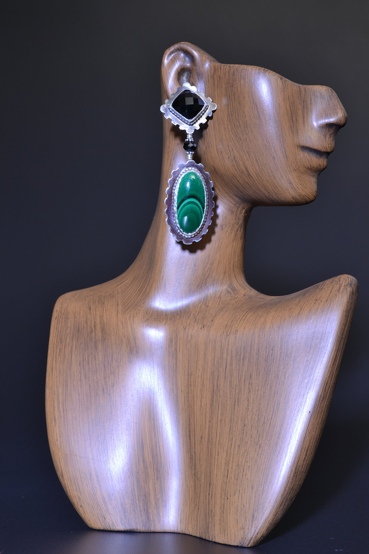 Simmons says, "Malachite is one of the most important stones for protection from negative energies." Maybe he is right: these earrings make me feel happy with their movement and blending of colors. The faceted Black Onyx picks up the dark swirls in the Malachite; the Malachite makes a lovely spot of color around the face. I think you might like these... Please note the weight, they are a little heavier than most of my earrings.