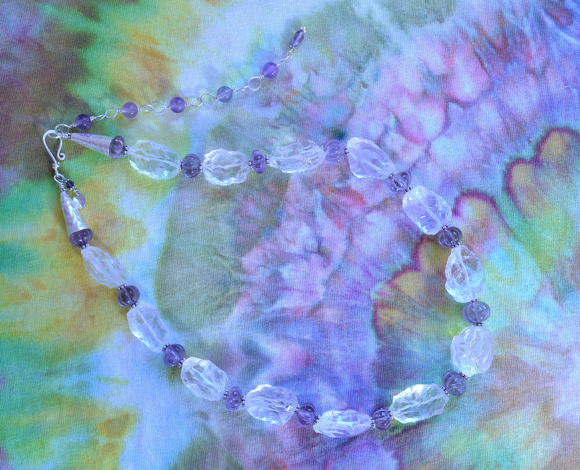 Admit it, you came to this page for the tie dye!* But now that you're here, perhaps you will take a look at this hand-hammered Quartz necklace. Big chunks of water-clear Quartz have been textured by hand to look like cracked ice. They were likely lightly tumbled since they have a smooth finish and will not snag clothing. Pale carved amethysts are interspersed to add a little color. It is all about the beautiful stones and would be perfect with winter white, spring colors and tie dye.