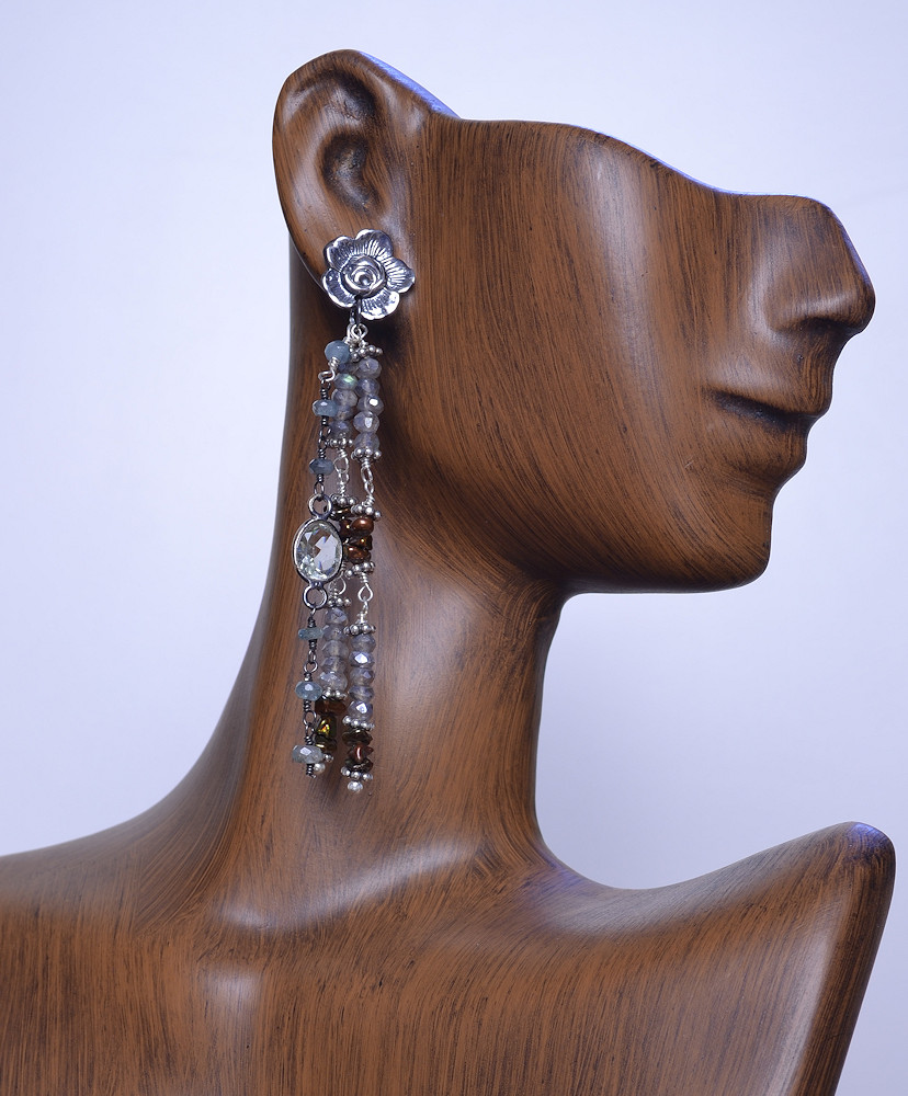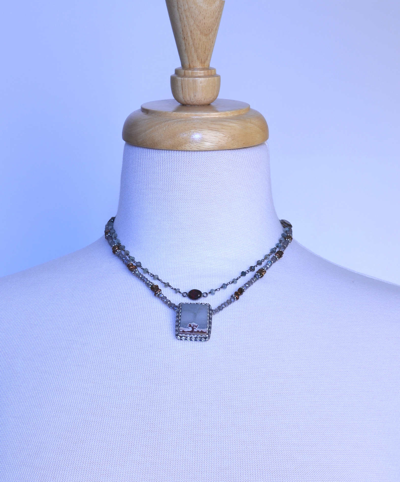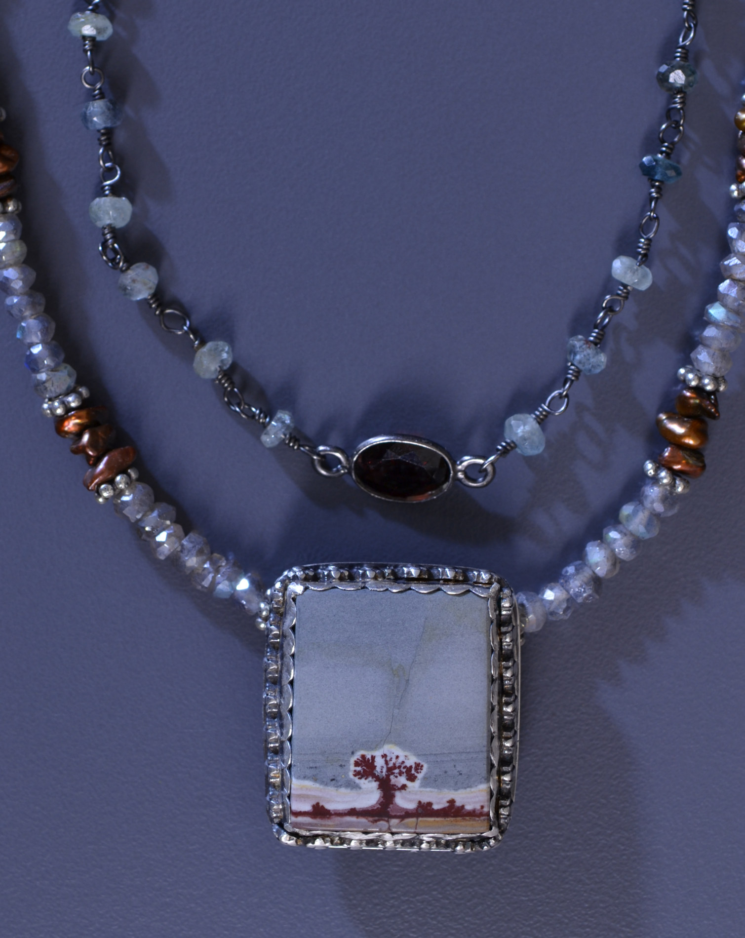 I hope you appreciate this little stone with it's pretty desert landscape! It seemed be happy with labradorite which I used in the necklace and included in the little oxidized sterling chain. The chain also has some larger faceted stones, the one in the center is likely a garnet. The earrings are long and delicate. Please order this one-of-a-kind set and enjoy wearing it with business attire, a feminine lace blouse or a tee shirt. It's a versatile set that works with a wide range of colors.
