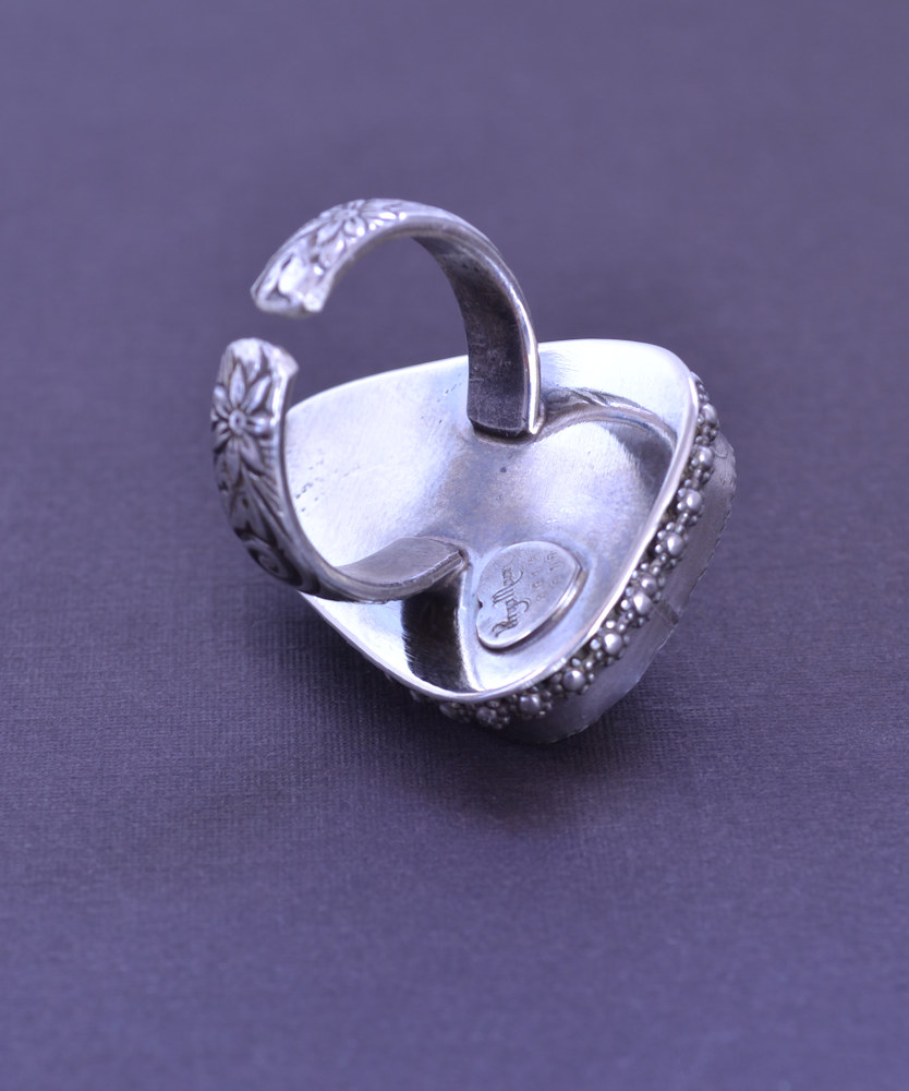 This is a large ring, you might enjoy wearing it on your index or middle finger so I made it a larger size. It is presently approximately size 9½ but it is adjustable. The band is quite heavy, I strongly recommend you give me your ring size when you order so I can shape it for you. And please order it and wear it as you navigate the crosscurrents of our society.