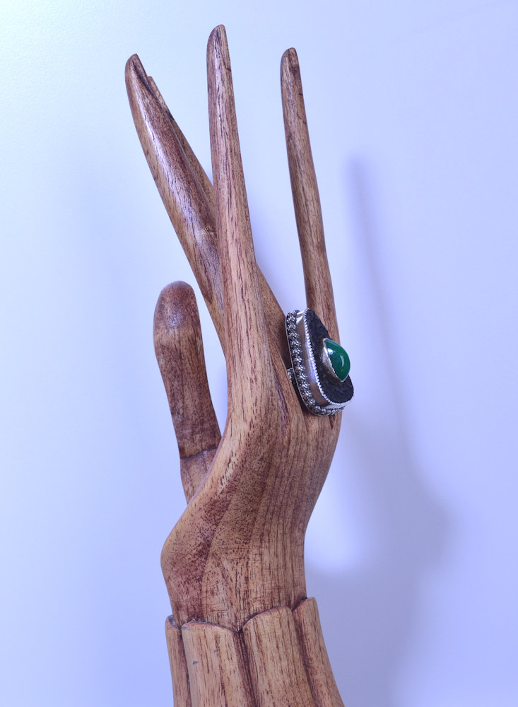 Sometimes my system of identifying my materials fails me, but I believe the pretty green stone in this ring is Variscite. It is set down into the turtle shell, surrounded by 14k gold, so it is well protected.