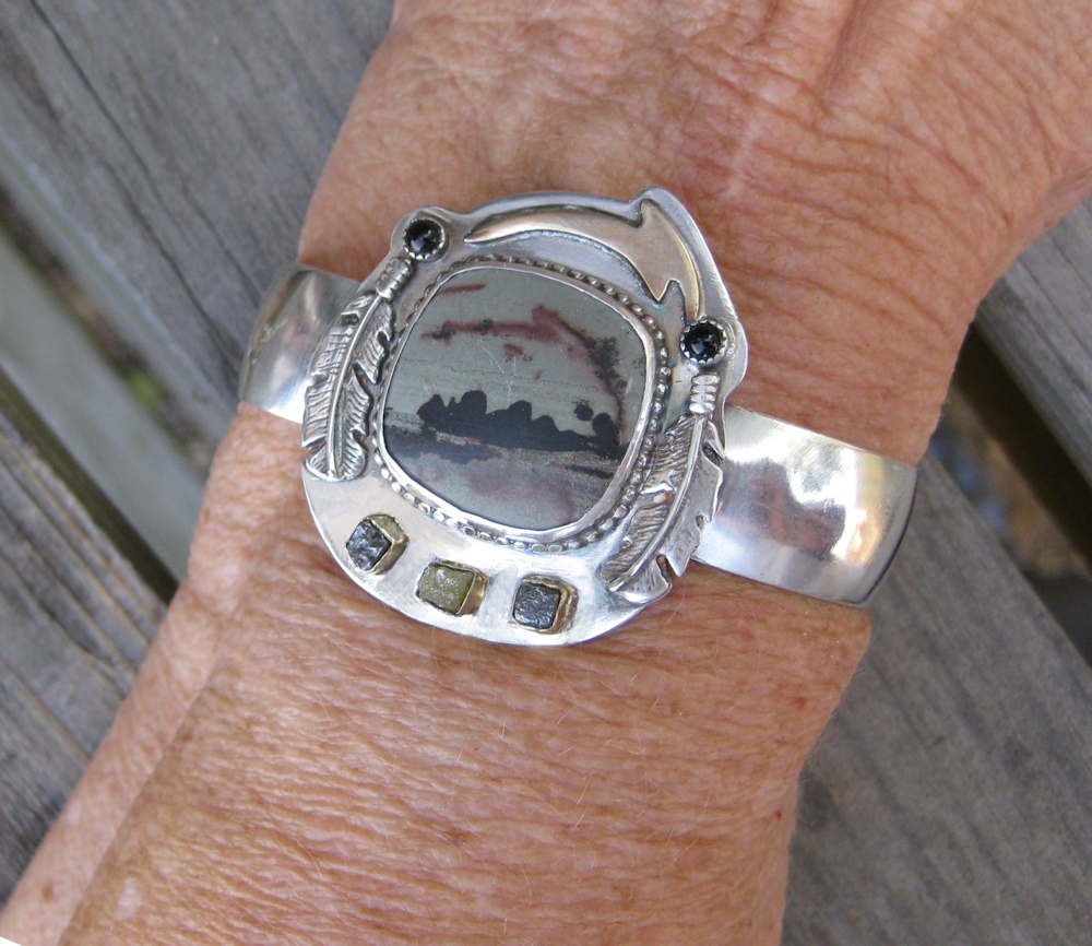 Indian Paint Rock is a highly scenic material. The stone does not take a high polish, this one has a matte finish. For some reason it demanded the companionship of the raw diamond cubes. The substantial cuff itself has a gently domed surface.
