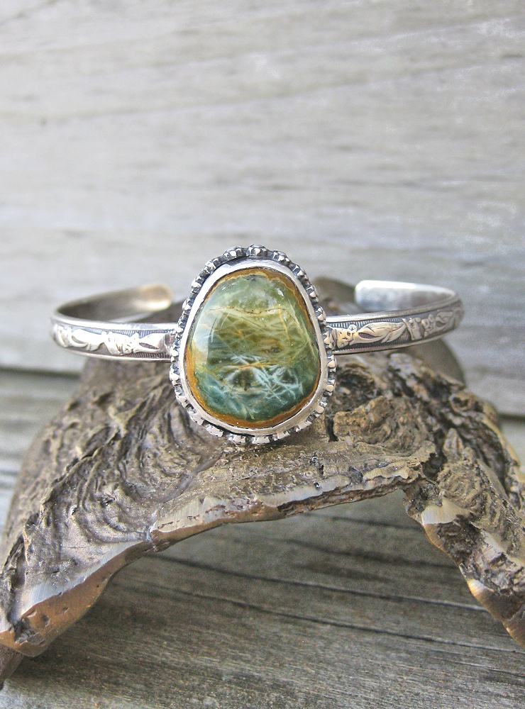 A sweet little cuff bracelet with a pretty little jasper from an unknown deposit. The unusual blue and the streamers remind me of Morrisonite. Fortunately Amy Nicole didn't slice it up and cut a standard oval or circle shape out of it. Instead she kept the stone's natural shape (you can see the butterscotch outer edge) and preserved the beautiful natural image making it so much more beautiful and interesting than it otherwise might have been. This is an example of why I use stones from cutters who honor the material. I hope you will like it!