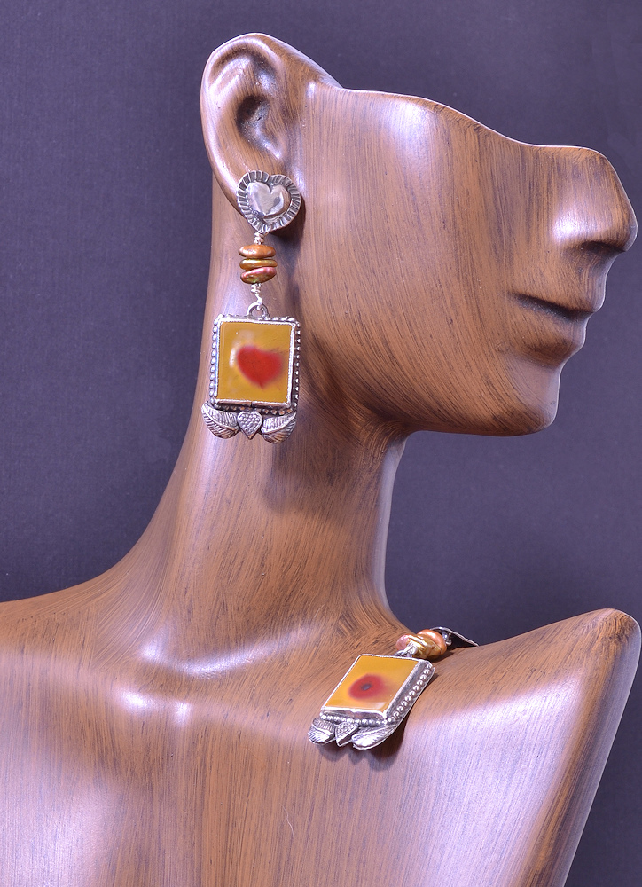 The cutter found a little heart inside this stone! This pair shows how the different materials in a stone change throughout: one slice has the heart, the other a circle of love. I thought the two pieces were very cool, so made these little earrings for you.