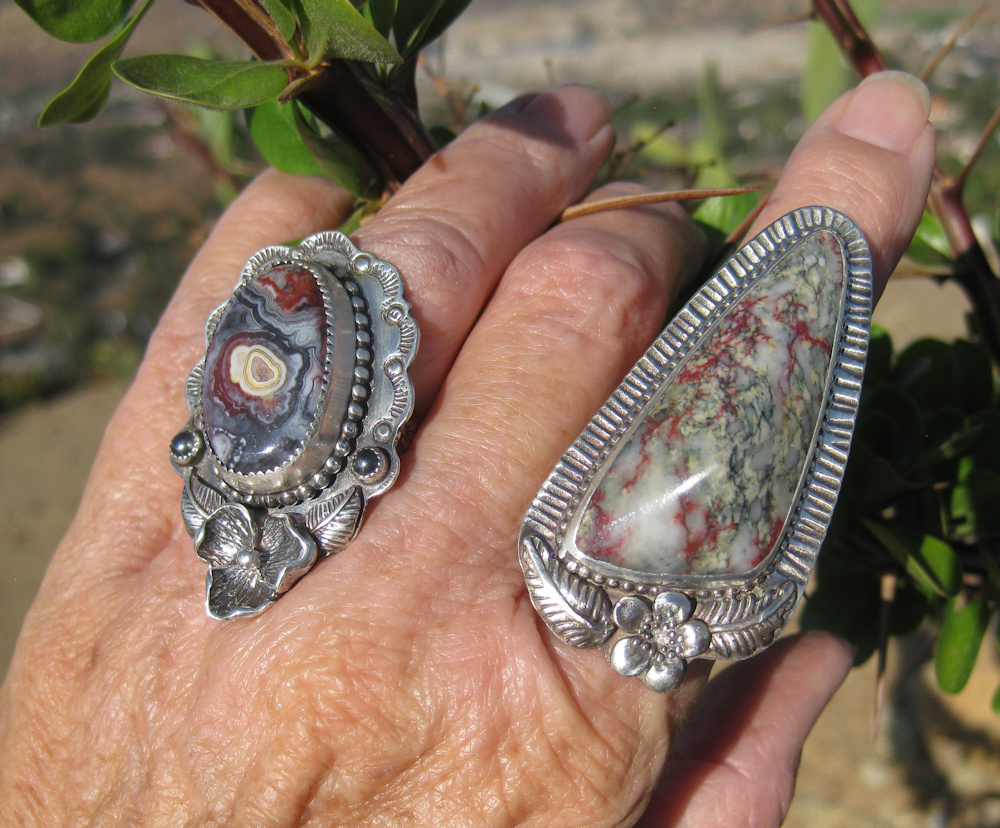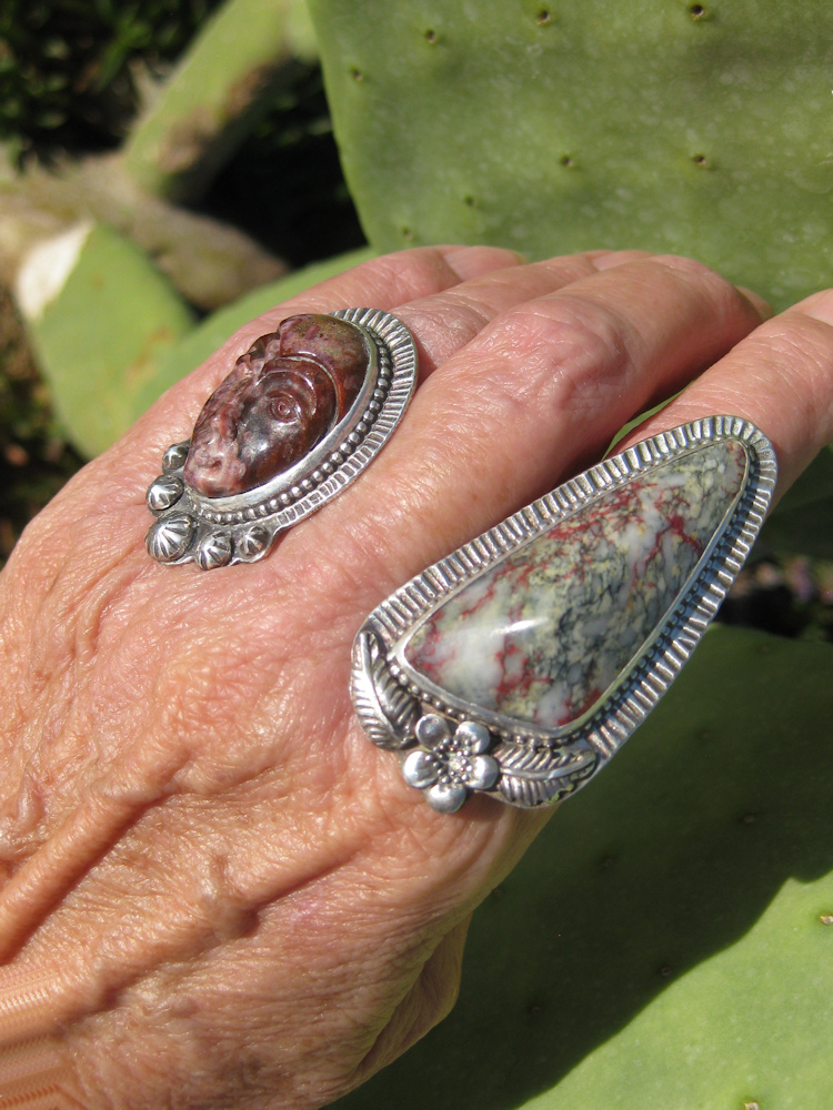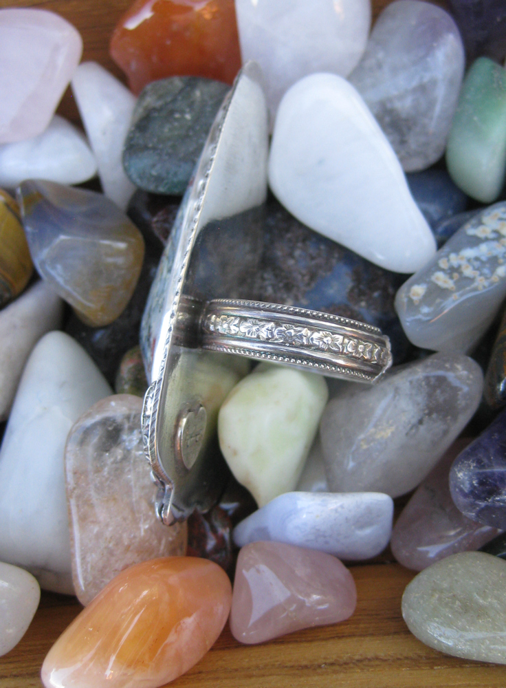 Here is an unusual example of Cuprite, a minor copper ore. The large stone is subtle with its greys and streaks of red Cuprite so it plays nicely with other rings in a fantastic stack, or by itself with business or casual attire. It looks great worn on any finger.
