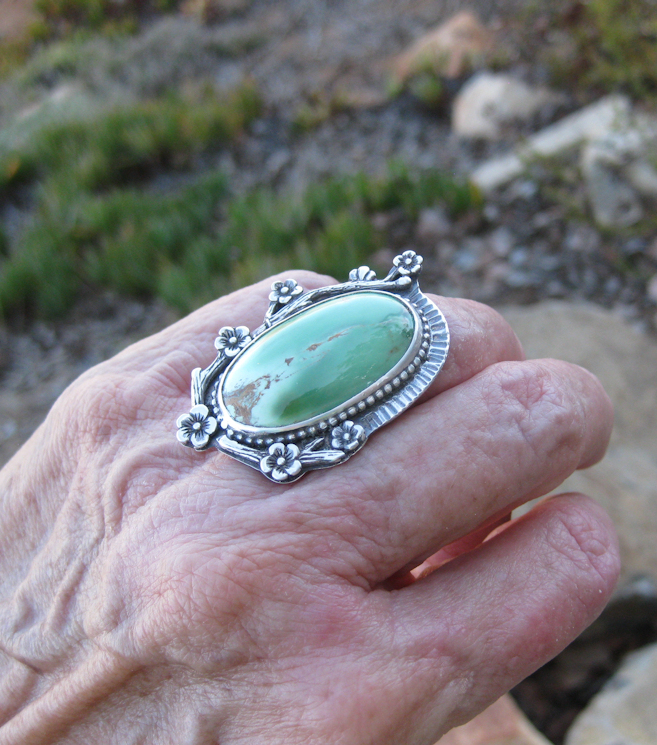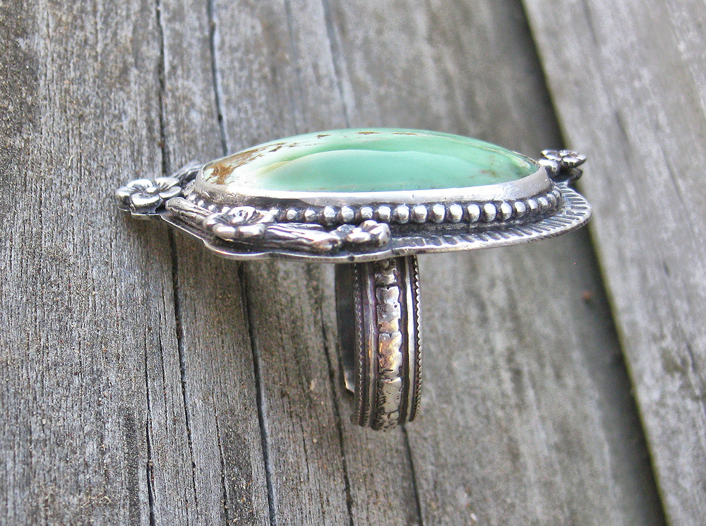 Top: 1 3/4" x 1 1/8" (4.5 cm x 3 cm) Weight: .6 oz (18.1 gm) Open ring is adjustable between sizes ~6 - 10. Please let me know what size you need since adjusting the heavy band requires tools.