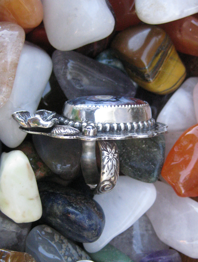 This little stone has a lovely picture of a luscious cabbage rose. There is often something delightfully quirky and lovable about Michael's stones. Close inspection of this one for example suggests that he cut it to maximize the best of the stone rather than to fit some artificial template guideline. To me that gives this stone a personality it might not have had if he had forced it into a perfect standard shape. I hope you'll like this ring as much as I do!