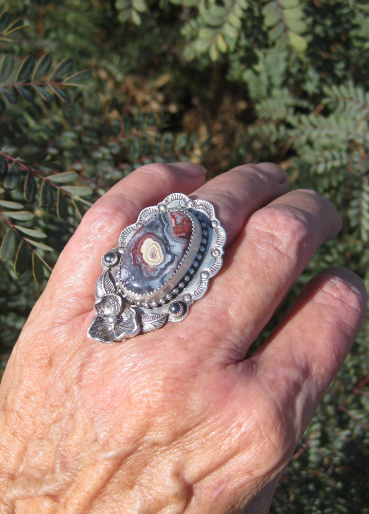 For those of you who enjoy the popular trend of wearing a stack of rings, the lower two photos show ideas for wearing this ring with others from Virgo Moon. Price shown is for the Lace Agate Rose Ring alone.