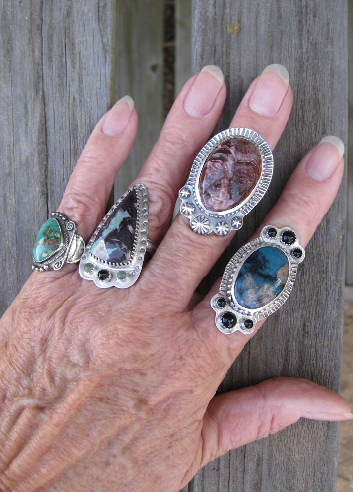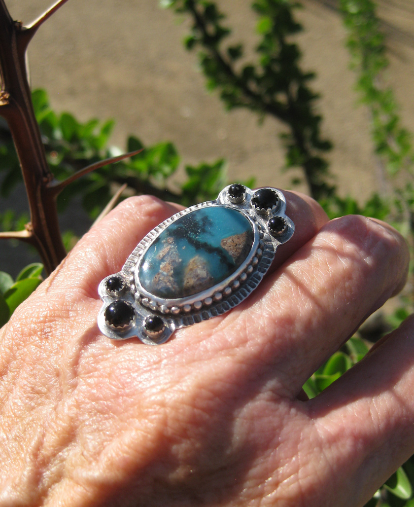 You may have noticed I'm partial to stones with pretty scenes in them, like this lovely Needles Blue. It seemed perfect for a ring. You'll find it blends with nicely with Turquoise, also with black and brown stones as well.