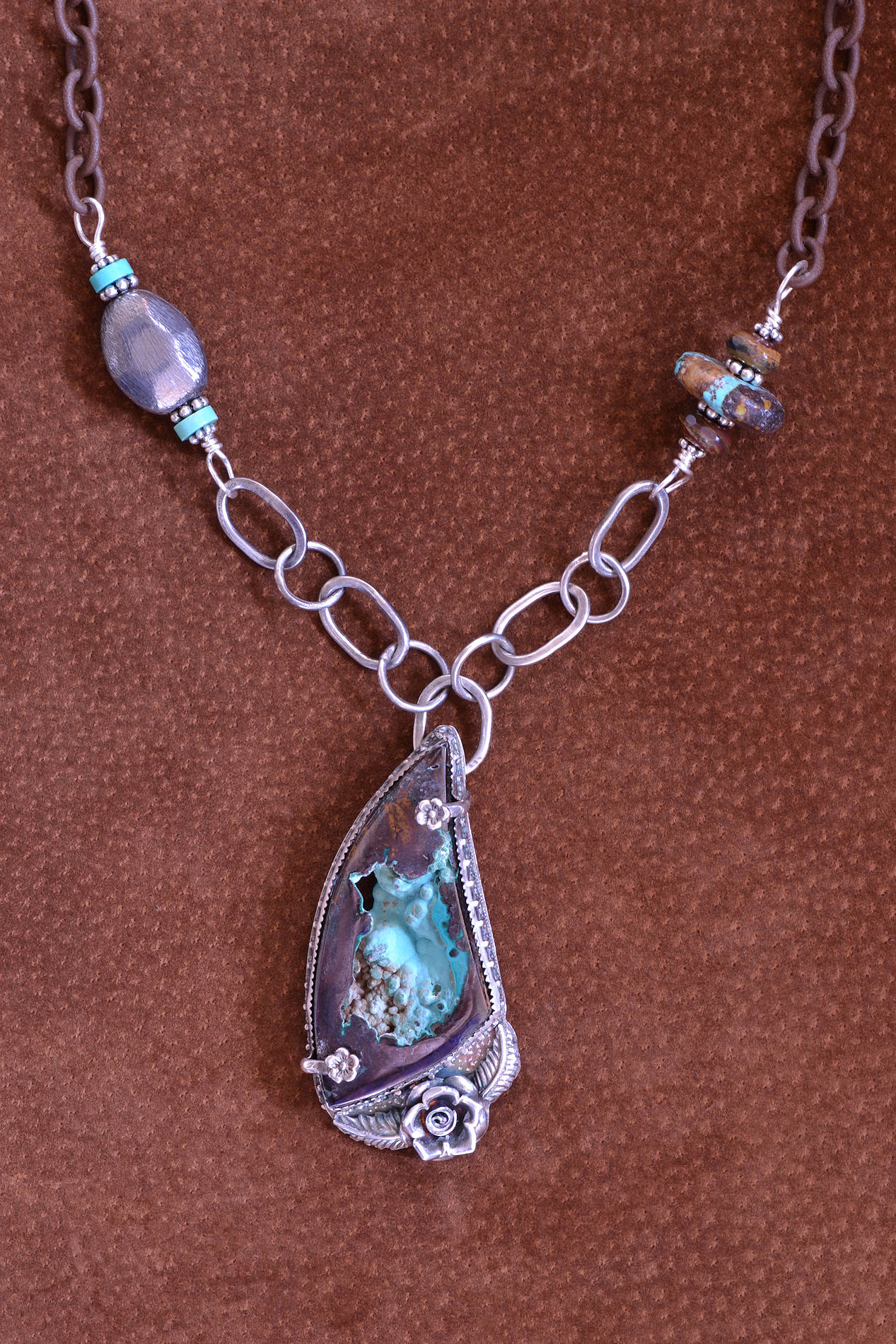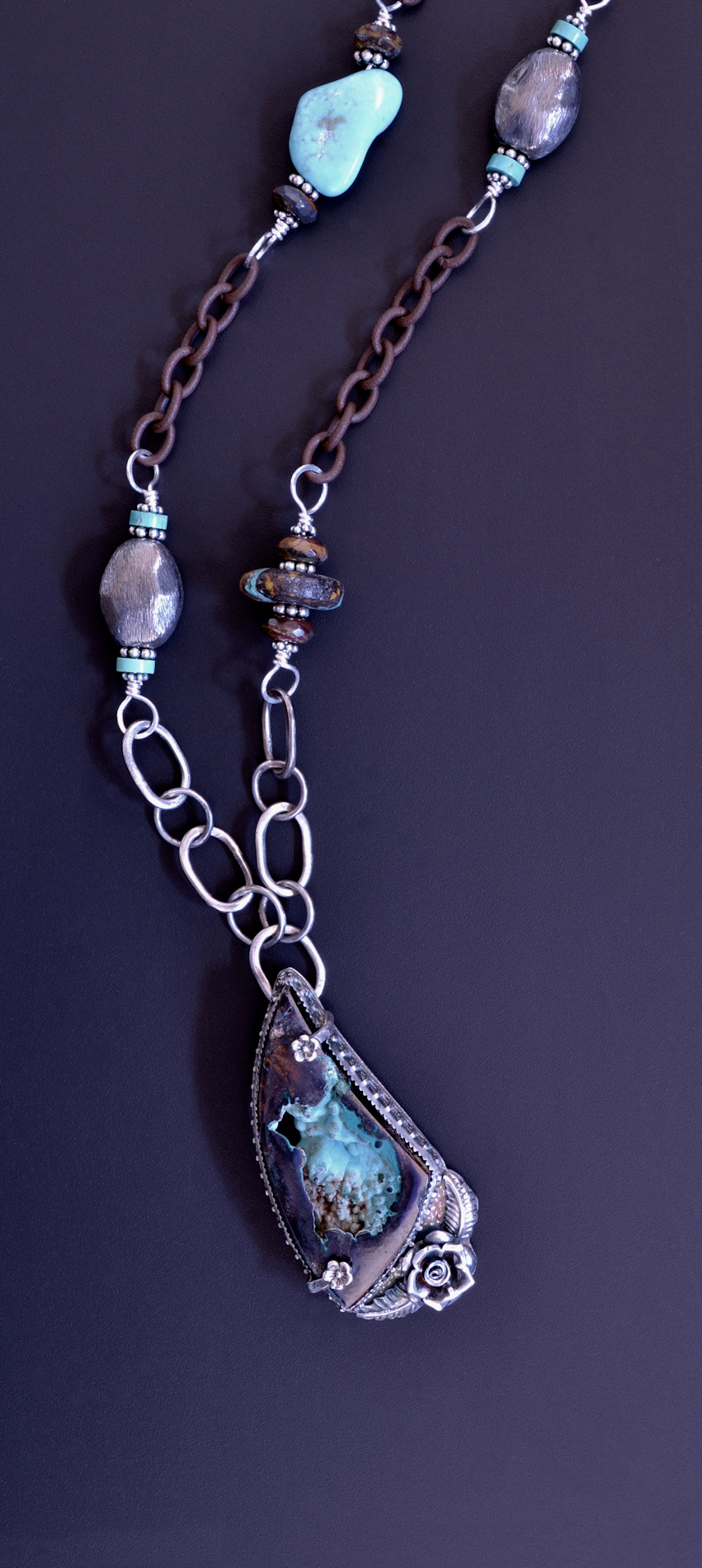 What makes Rosasite so interesting also makes it difficult to use in jewelry. This example of Rosasite in Iron Hat (Gossan) has such a nice shape with such lovely colors, I had to try to use it. Leigh left the stone very thick to capture as much of the pretty blue green lake as possible, leaving the sturdy mahogany Iron Hat surrounding it for strength and color contrast. You'll find a heron on the back, scanning the water for a tidbit. A combination of chain elements including handmade sterling and sterling and turquoise beads supports the pendant.