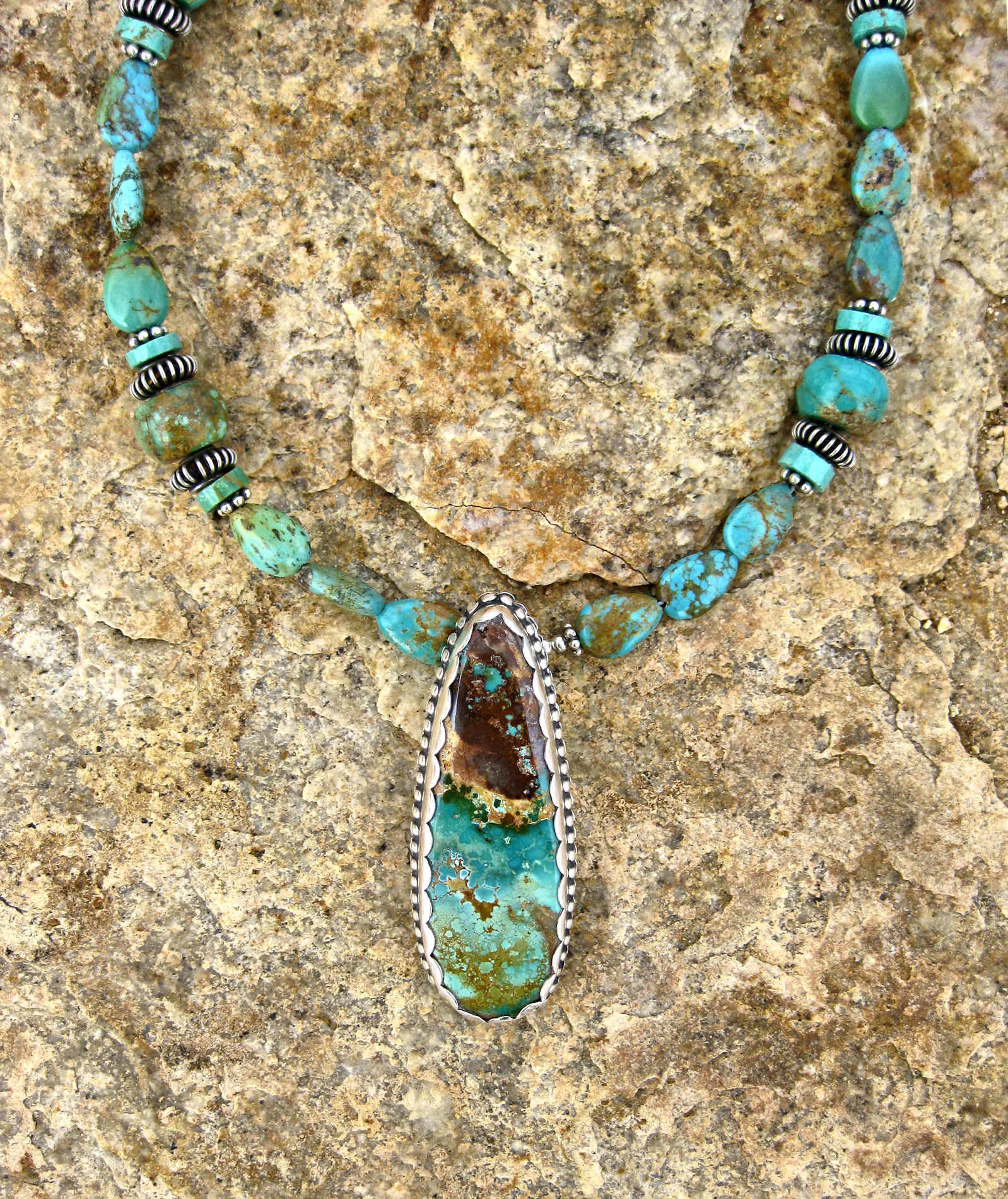 A scenic pendant of Royston Turquoise sits amidst a long strand of turquoise and sterling beads. What many people value about Royston is the lovely combination of brown matrix with Turquoise as you see here.