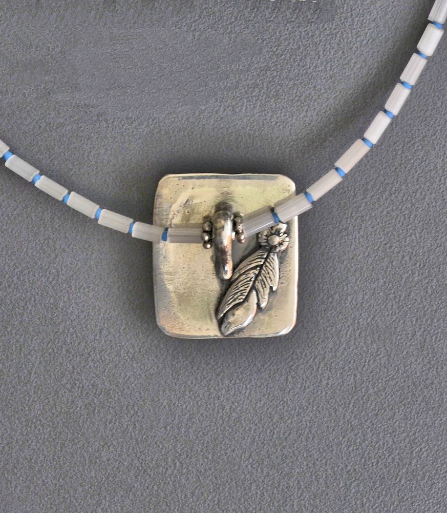 The delicate necklace consists of vintage satin glass tubes (~2mm in diameter) interspersed with tiny seed beads to reflect the colors in the stone. Satin glass has a remarkable inner glow. How is it made? We can see the tiny tubes are drawn (pulled to a smaller diameter while hot), not wound individually around a mandrel. But beyond that, hmmm. Unfortunately there seems to be very little information relating to the history and production of seed beads, but Peter Francis Jr.'s Beads of the World came to the rescue: He tells us that "satin glass is made by purposely introducing bubbles into the glass. When the tube is drawn out the bubbles elongate and produce a satiny effect.. Mostly Czech, where they are called 'Atlas' glass."