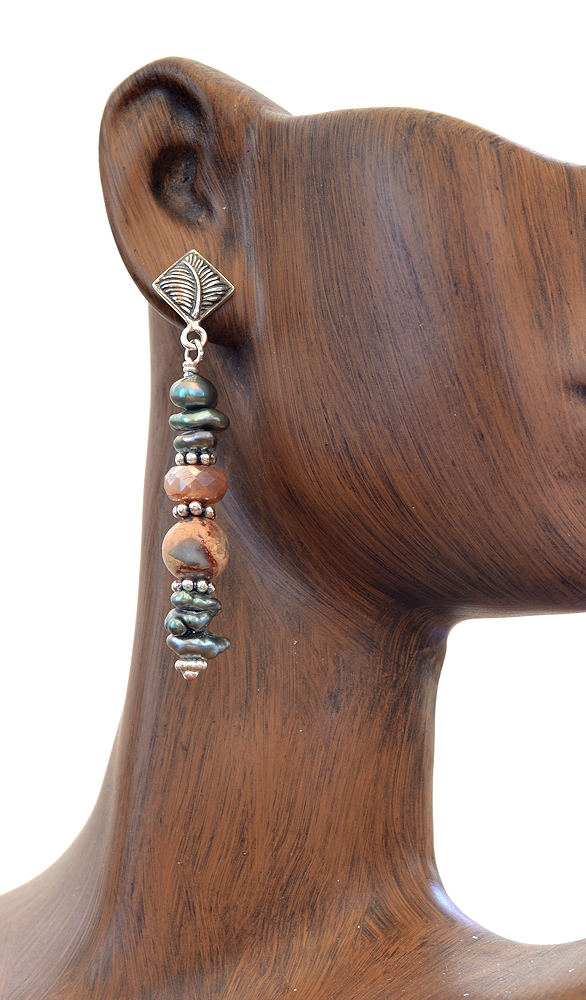 This necklace features a lovely Gary Green cabochon. As the story goes, the material was named by Gary Macintosh, the founder of the McDermitt Rock Shop in McDermitt, Nevada. It has many other names including Larsonite, Swamp Bog, petrified bogwood, McDermitt Green Jasper, Harlequin Ribbon, etc. The name Larsonite is explained by a comment from Gary Larson on dirtyrockhound's blog which says, "Raymond Larson is my father, I was with him when he first found the Larsonite." It sounds to me like it should be called Larsonite but experts contend that based upon the convention established in 1875, the suffix "-ite" should be reserved for different mineral species and not be used to distinguish varieties of a material like Jasper.